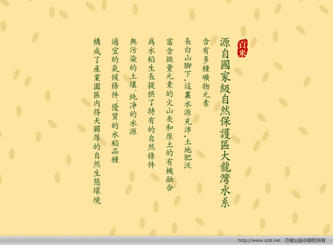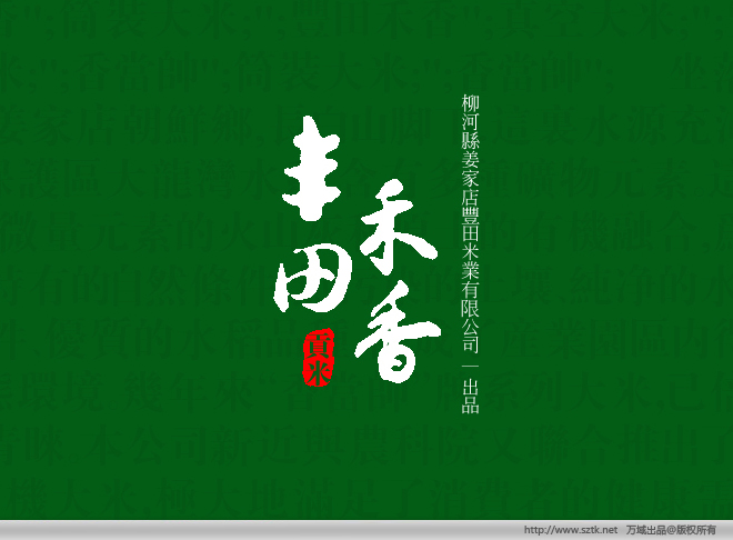 [ 吉林 ] 豐田米業|品味國家級自然區帶來的營養健康 項目概況:包裝設計案例|保健品包裝設計|五谷雜糧包裝設計|禮品包裝設計|茶葉包裝設計|標志設計 客戶背景:柳河縣姜家店豐田米業有限公司,中國吉林通化柳河姜家店,主要經營";豐田禾香";筒裝大米;";豐田禾香";真空大米;";豐田禾香";箱裝大米;";香當帥";筒裝大米;";香當帥"; 坐落在吉林省柳河縣姜家店朝鮮鄉,長白山腳下.這里水源充沛,源自國家級自然保護區大龍灣水系,含有多種礦物元素。這里土地肥沃,富含微量元素的火山灰和原土的有機融合,為水稻生長提供了特有的自然條件。無污染的土壤、純凈的水源、適宜的氣候條件、優質的水稻品種,構成了產業園區內得天獨厚的自然生態環境。幾年來“香當帥”牌系列大米,已倍受廣大消費者的青睞。本公司新近與農科院又聯合推出了“豐田禾香”系列有機大米,極大地滿足了消費者的健康需求。公司擁有國內領先的精加工立式碾米機、電腦篩選機、拋光機、電子定量包裝機、真空包裝機等先進設備。公司通過了農業部質量認證中心無公害產品認。