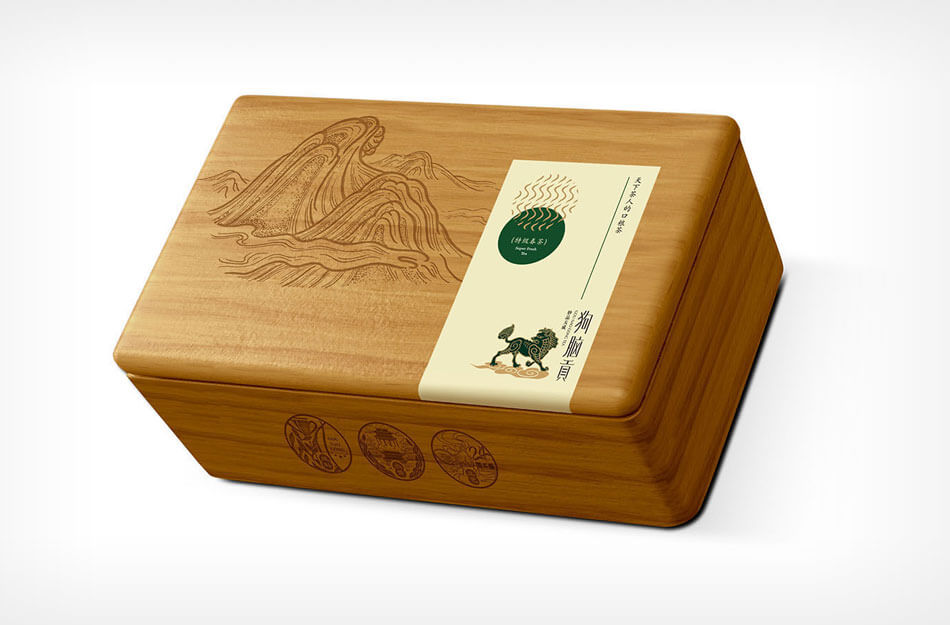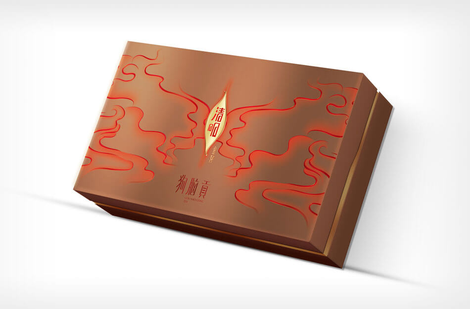 茶葉盒包裝設計|狗腦貢|祥瑞妙品天成茶:狗腦貢茶產于羅霄山脈南端的資興市湯溪鎮(原湯市鄉與皮石鄉合并稱湯溪鎮)境內狗腦山一帶。湯市氣候溫和,地理獨特,境內山巒疊翠、云霧繚繞、空氣清新,無污染,是湖南省著名的名優茶之鄉。狗腦貢,乃是貢茶,古時皇室貢品。狗腦貢茶以獨特的優良品質、穩定可靠的產品質量、誠實守信的營銷方式,深受消費者歡迎。