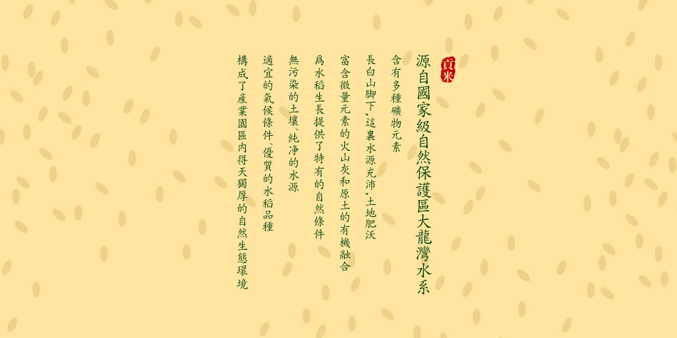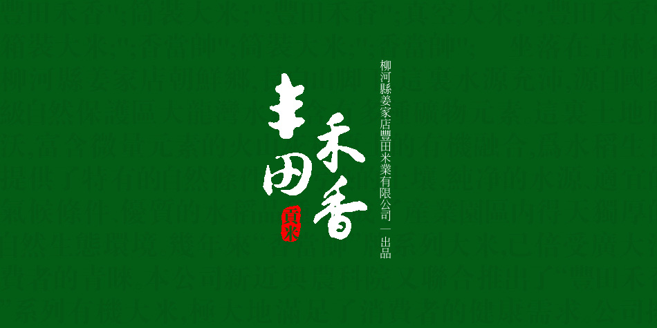 柳河縣姜家店豐田米業有限公司,中國吉林通化柳河姜家店,主要經營:豐田禾香筒裝大米;豐田禾香真空大米;豐田禾香箱裝大米;香當帥筒裝大米; 坐落在吉林省柳河縣姜家店朝鮮鄉,長白山腳下.這里水源充沛,源自國家級自然保護區大龍灣水系,含有多種礦物元素。這里土地肥沃,富含微量元素的火山灰和原土的有機融合,為水稻生長提供了特有的自然條件。無污染的土壤、純凈的水源、適宜的氣候條件、優質的水稻品種,構成了產業園區內得天獨厚的自然生態環境。幾年來“香當帥”牌系列大米,已倍受廣大消費者的青睞。本公司新近與農科院又聯合推出了“豐田禾香”系列有機大米,極大地滿足了消費者的健康需求。公司擁有國內領先的精加工立式碾米機、電腦篩選機、拋光機、電子定量包裝機、真空包裝機等先進設備。公司通過了農業部質量認證中心無公害產品認。豐田米業大米包裝設計公司,香當帥大米包裝設計公司,豐田禾香大米包裝設計公司,有機米包裝設計公司,農產品包裝設計公司。